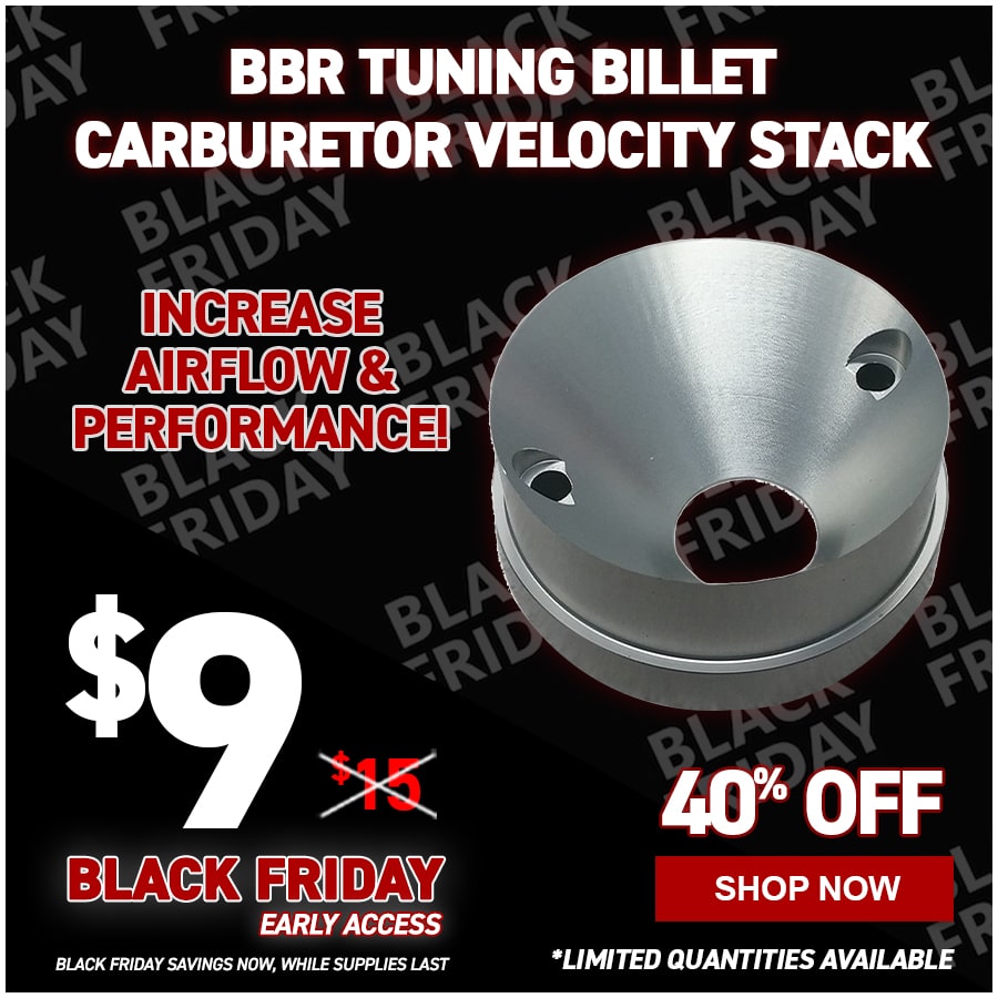 The BBR Tuning Carburetor Velocity Stack will give your motor bicycles engine a smoother ride, a throatier sound, and a slight increase in power. The velocity stack increases airflow into your gas powered bicycles motor for better air intake than standard carburetors will give you. Made of CNC machined billet aluminum, this Velocity Stack in a simple to install and great to use. By having a larger intake port, you'll have an increase in airflow into your carb and through your engine. With the BBR Tuning Velocity Stack, you're getting a smooth ride, a faster ride, and a sound that can't be beaten.