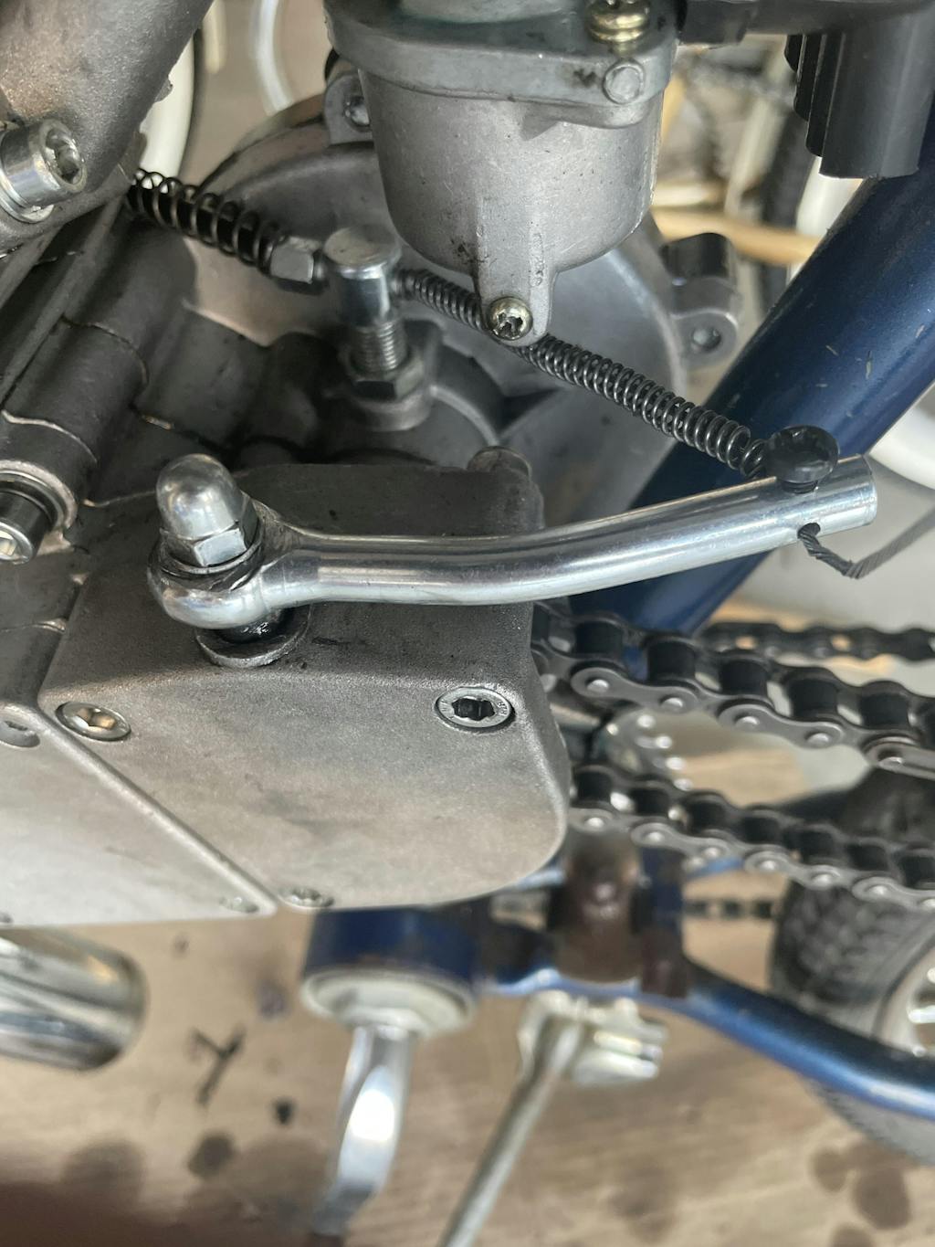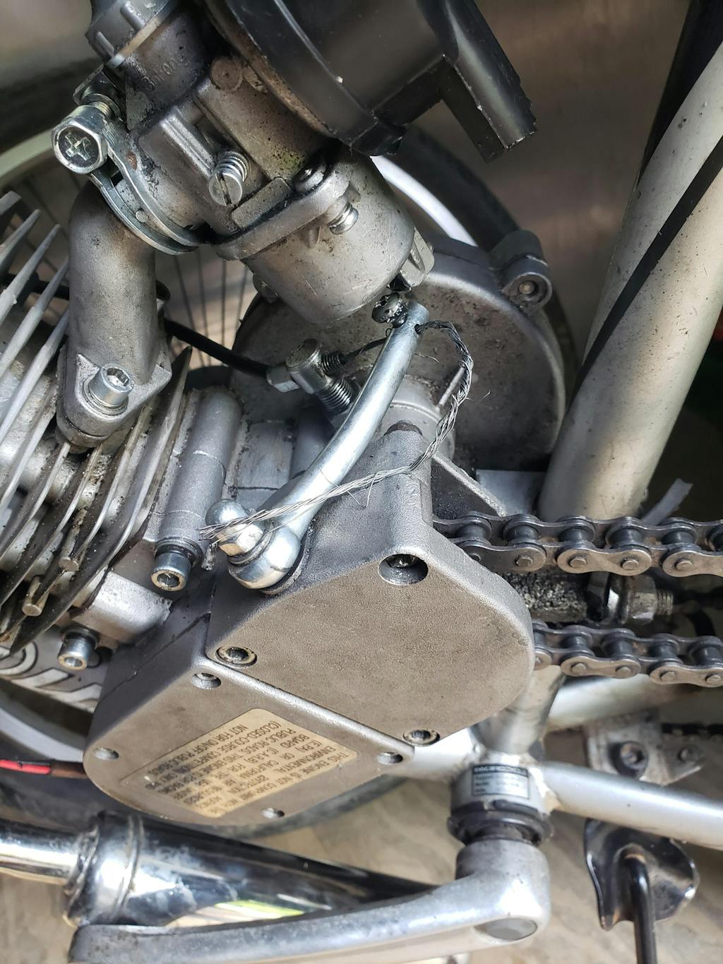 Located on the exterior of the 66cc (80cc) 2 stroke bicycle engine, the clutch arm should be spring loaded to be parallel to the engine. It is directly connected to the clutch cable and the clutch camshaft.
