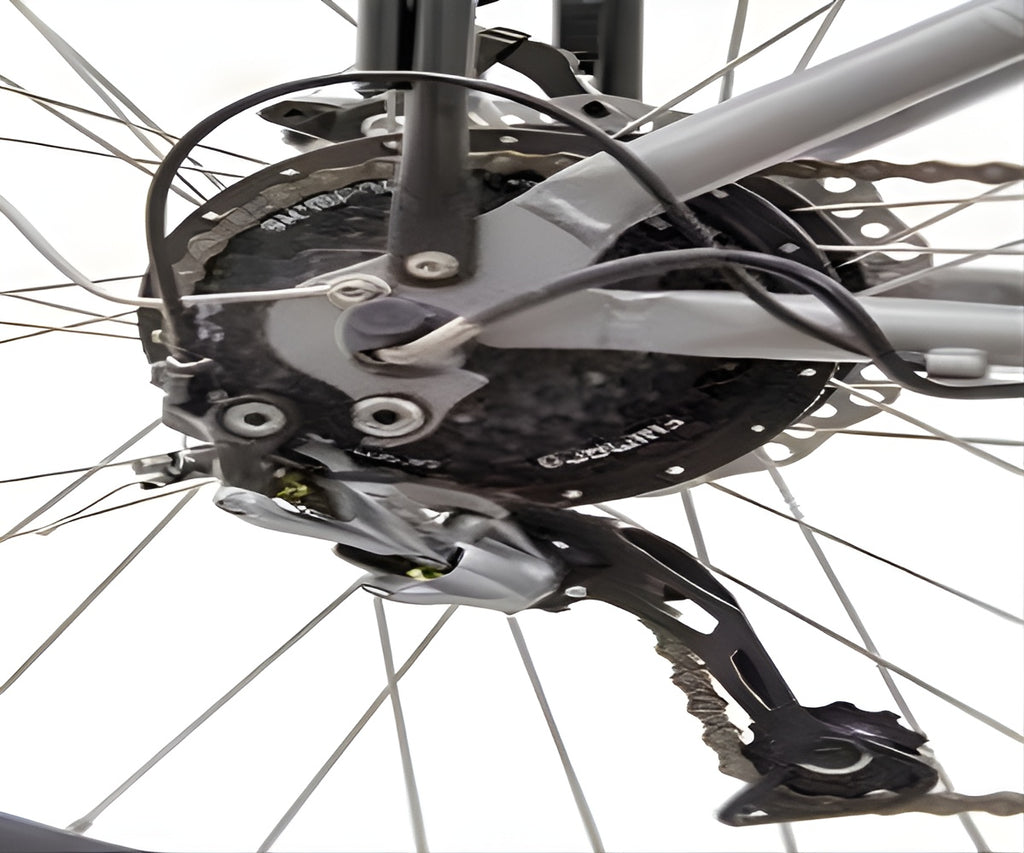 Drivetrain: 8-Speed Shimano Alivio Rear Derailleur paired with Shimano HG series cassette cogs and index shifters.