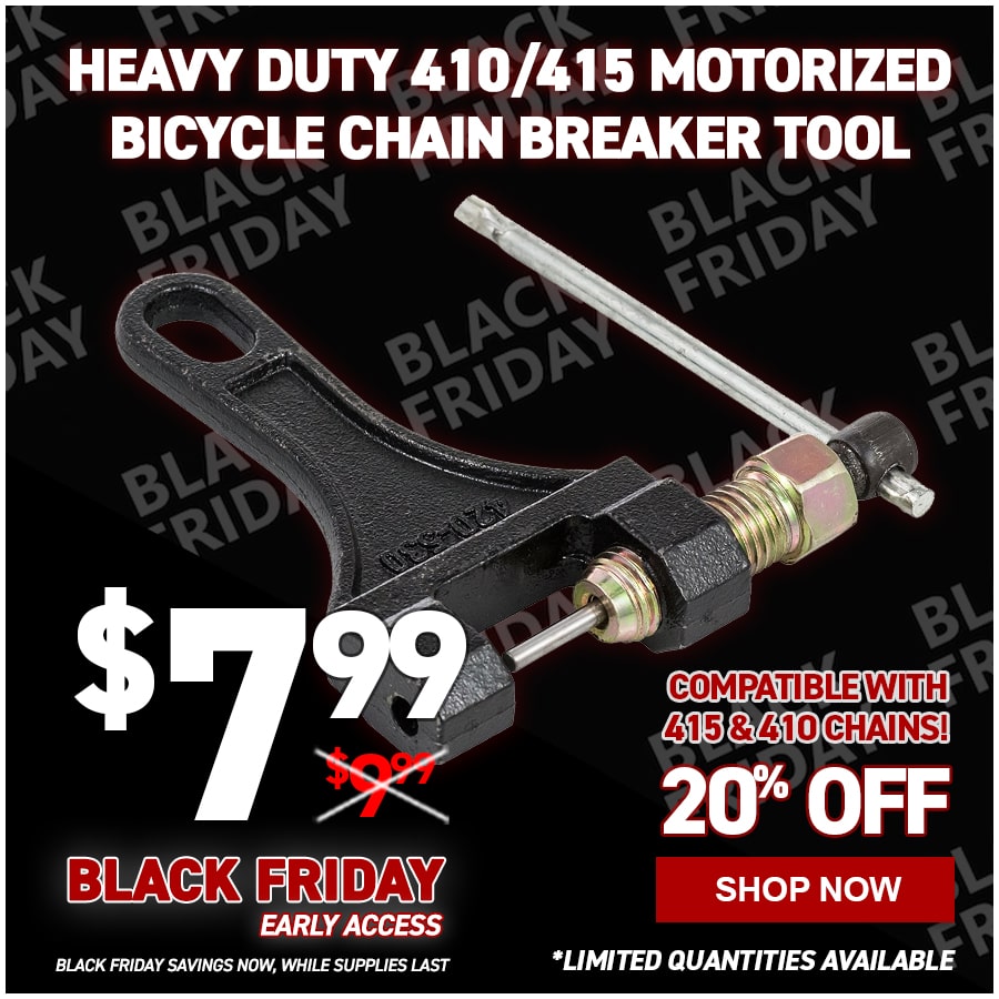 When it’s time to replace that rusted, busted chain on your motorized bike make sure you have the Heavy Duty 410/415 Motorized Bicycle Chain Breaker ready at your disposal. With a longer extracting punch than your regular chain breaker, there’s just about no chain this breaker can’t handle.
