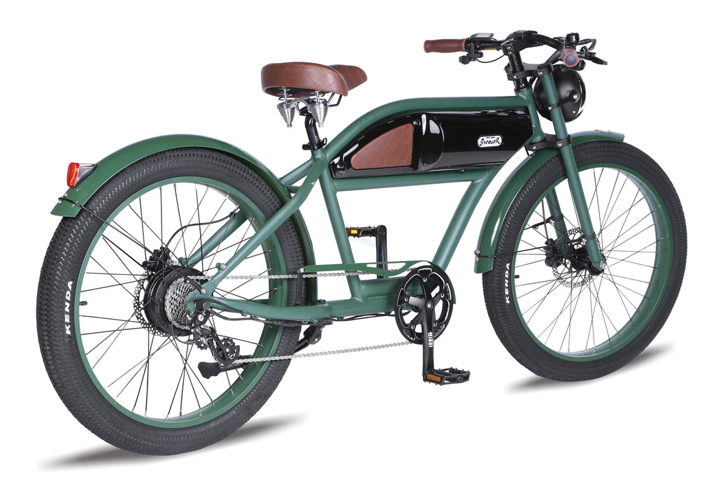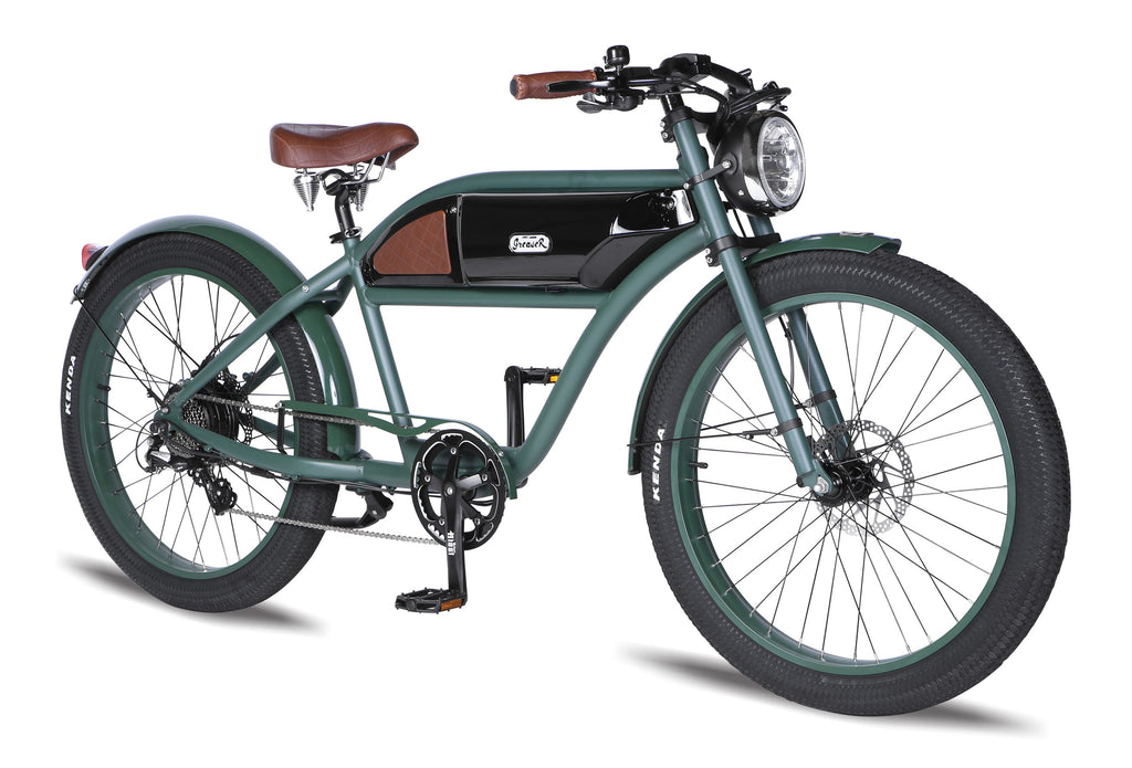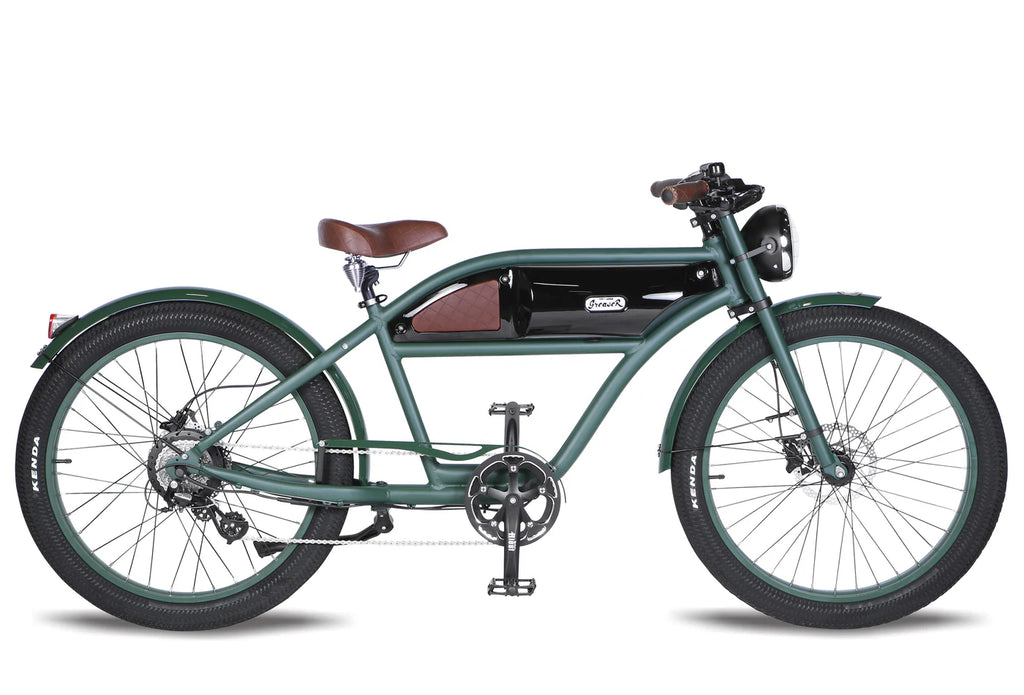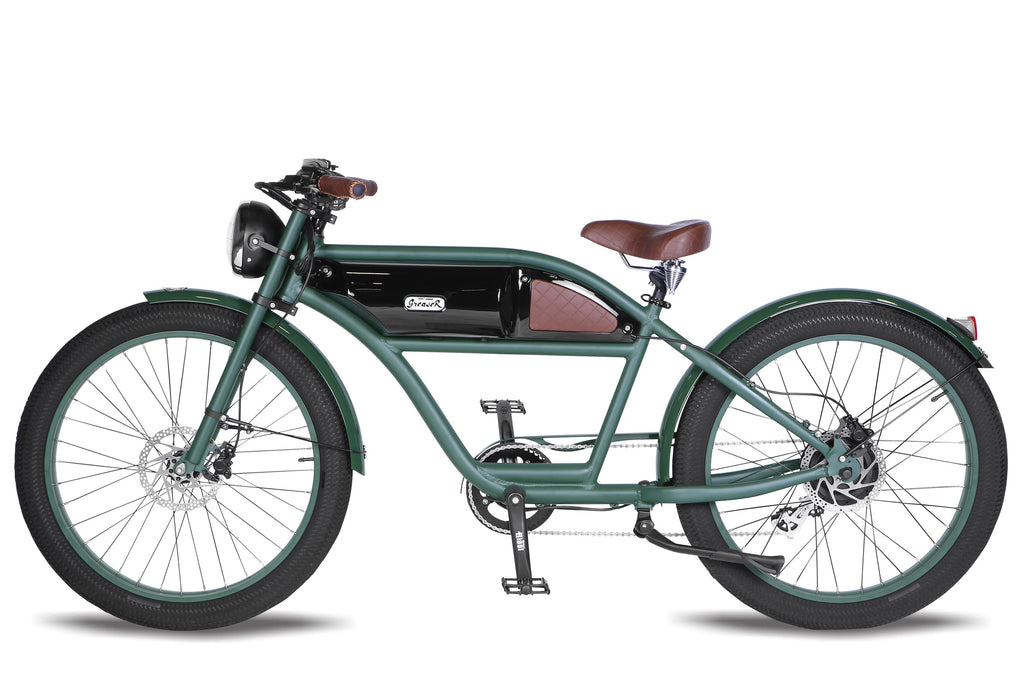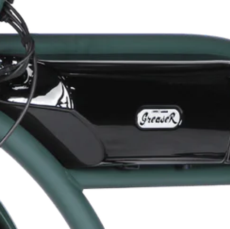 The bike's components are selected for quality and rider comfort, featuring a wide Velo extra-wide saddle and 26” x 3.00” Innova tires for a smooth, classic feel. Safety is handled by Taiwan Star Union Hydraulic Disc Brakes (180mm front rotor) with a motor cut-off function. The Greaser uses a Shimano Altus 7-speed derailleur for cycling flexibility and a 5-speed backlit LED display for managing the electric assist, making it an ideal choice for riders seeking a stylish, comfortable, and reliable cruiser.