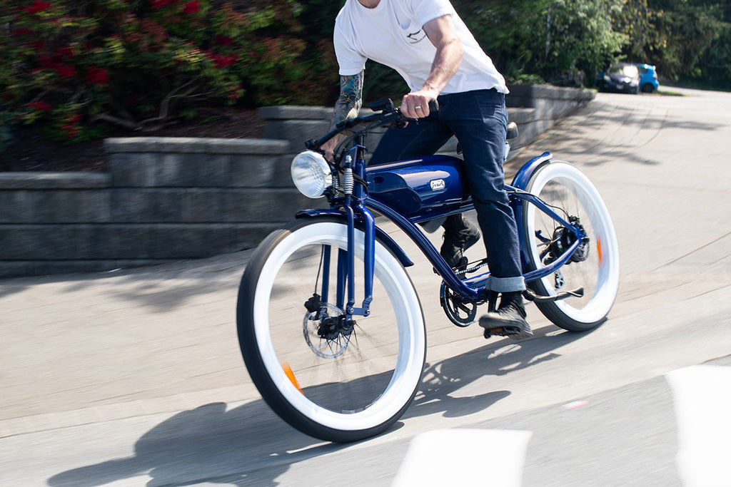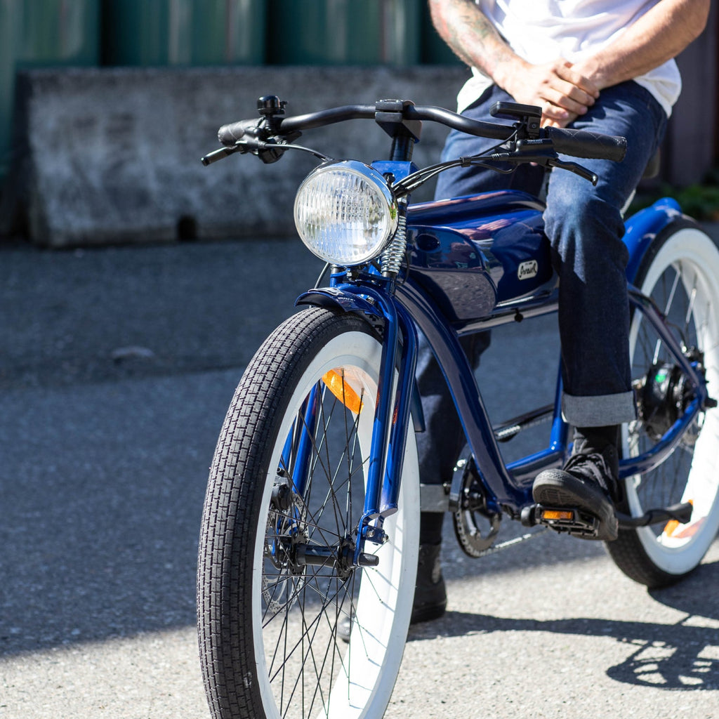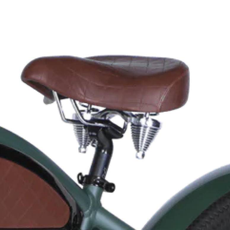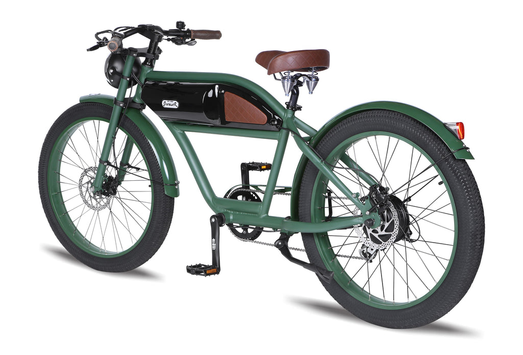 The bike's components are selected for quality and rider comfort, featuring a wide Velo extra-wide saddle and 26” x 3.00” Innova tires for a smooth, classic feel. Safety is handled by Taiwan Star Union Hydraulic Disc Brakes (180mm front rotor) with a motor cut-off function. The Greaser uses a Shimano Altus 7-speed derailleur for cycling flexibility and a 5-speed backlit LED display for managing the electric assist, making it an ideal choice for riders seeking a stylish, comfortable, and reliable cruiser.