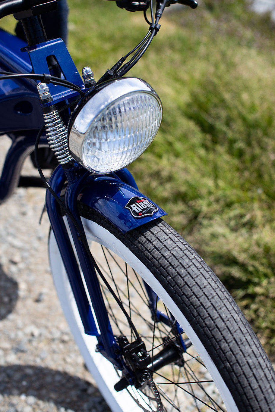 The Michael Blast Greaser Classic is a vintage-inspired electric bike designed as a throwback to the board-racer motorcycles of the early 20th century, offering a blend of nostalgic aesthetics and modern performance. It is equipped with a BAFANG 500W Geared Brushless Rear Hub Motor and a reliable 48V 14.5Ah Samsung lithium-ion battery. This configuration provides a powerful ride with an impressive range of approximately 37–50 miles (50 km) and a top speed of 22 mph, classifying it as a Class 2 eBike. The design prioritizes cruising comfort and style over rugged off-roading.