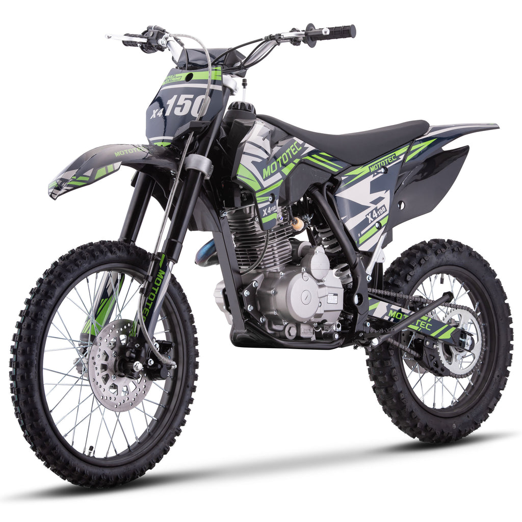 The MotoTec X4 150cc 4-Stroke Dirt Bike - The latest generation of 150cc mini bike engines are faster, torquier, more reliable and even easier to set up and start than ever before. Electric start, improved carburetor and all of the standard safety features, support and reliability that MotoTec provides.