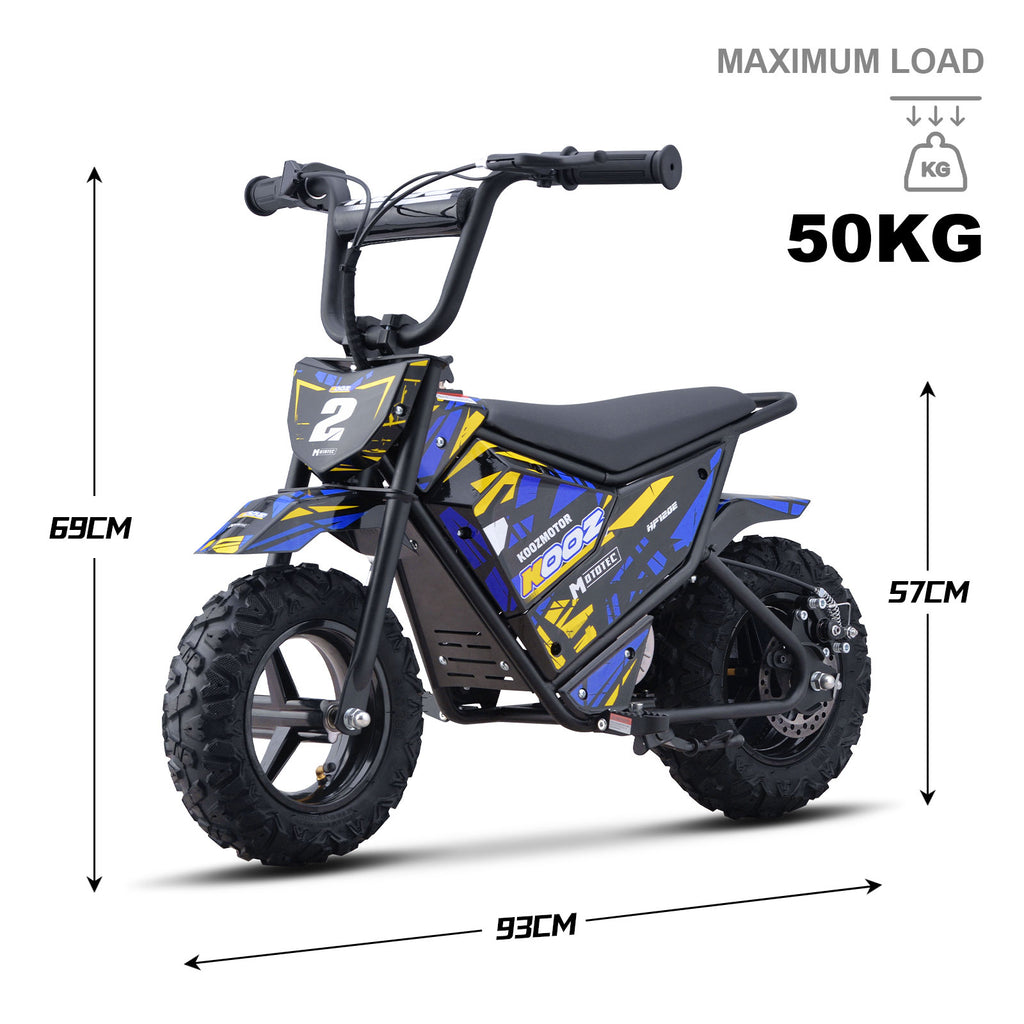 The MotoTec 24V 250W HP120E is a rugged, entry-level electric mini bike designed specifically for young riders aged 6 and up. Combining a classic "old school" frame design with modern electric power, it offers a safe and manageable introduction to motorized riding. The bike is built around a durable steel frame and features knobby pneumatic tires, making it capable of handling driveway pavement or light off-road terrain with ease.