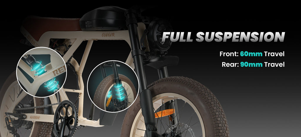 Dual suspension: Front: 60mm travel, Rear: 230mm length, 90mm travel