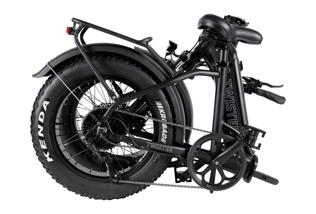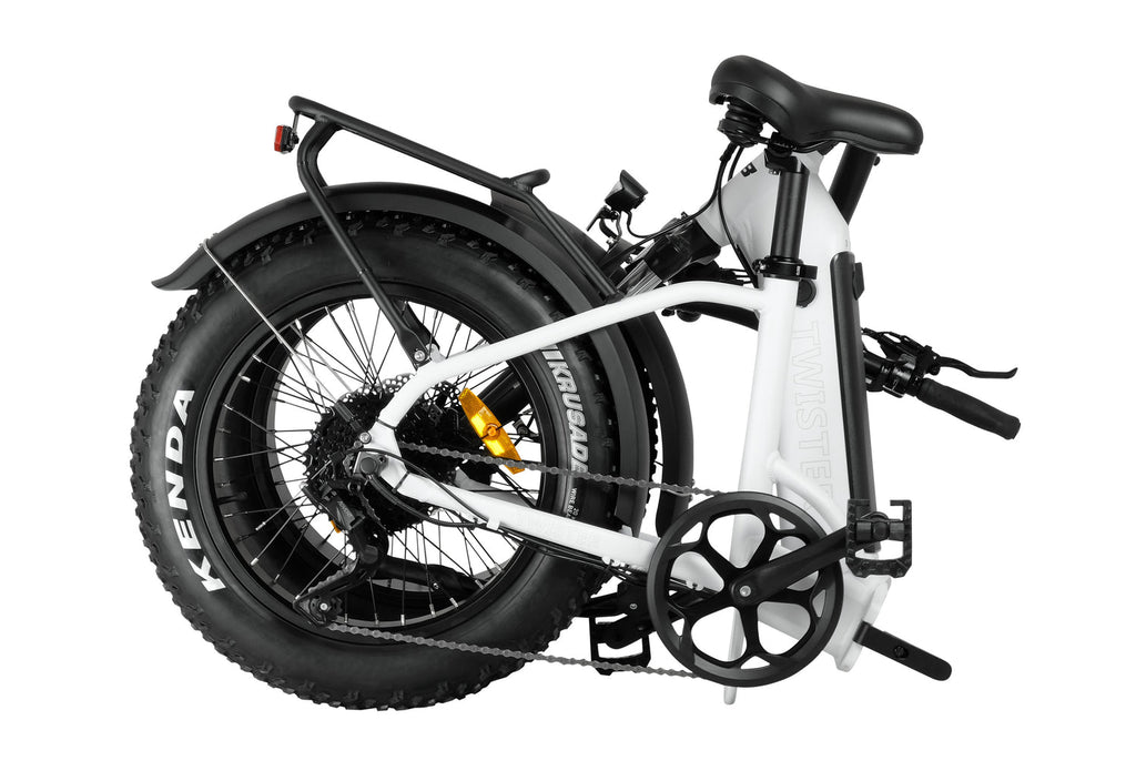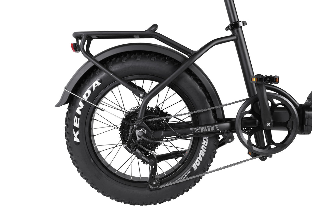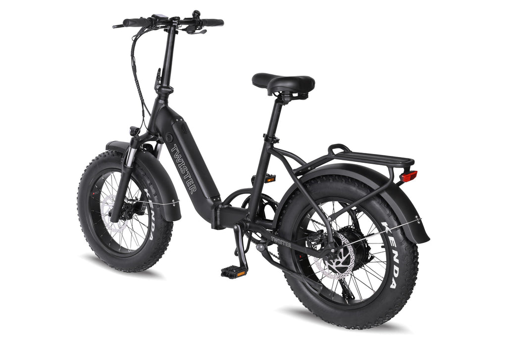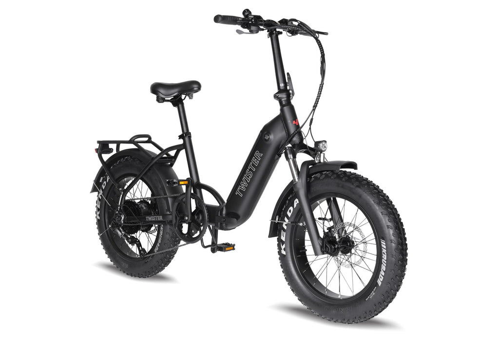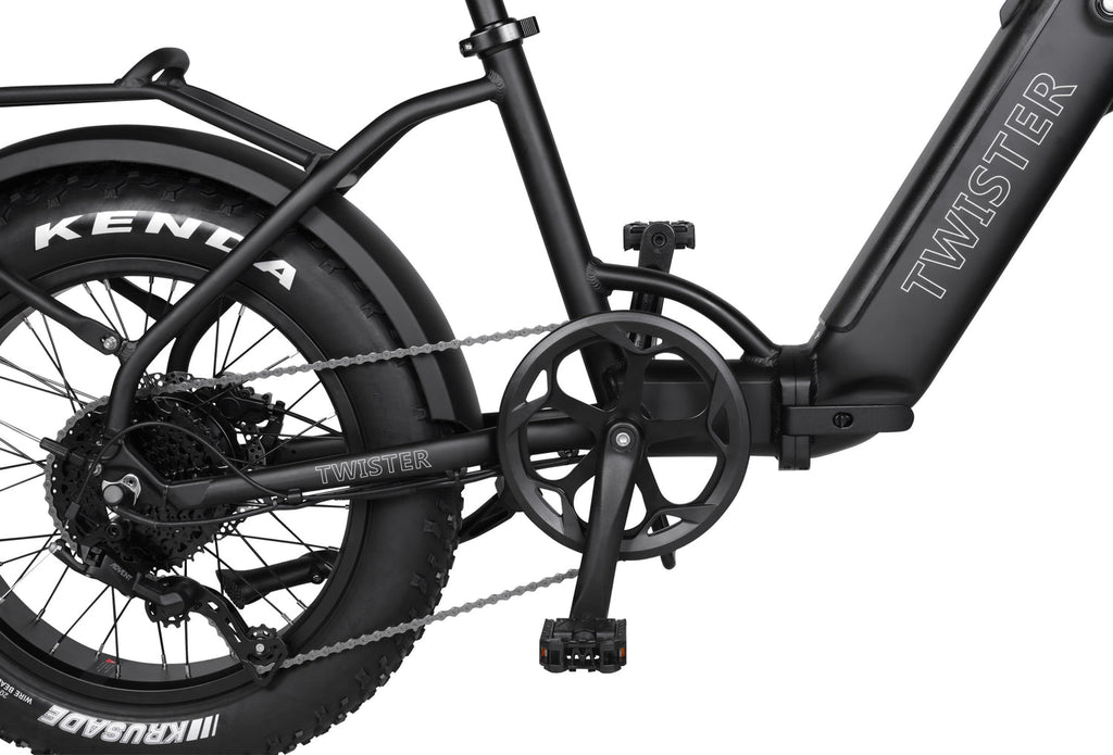 This eBike ensures comfortable and safe riding across diverse conditions, from city streets to light trails. It features aggressive KENDA KRUSADE 20” x 4.0” fat tires for superior stability and traction, complemented by responsive hydraulic disc brakes (180mm rotors) for reliable stopping. The addition of a Shimano Altus 7-speed drivetrain, a throttle, and cadence sensor pedal assist, all viewed on a monochrome LCD display, makes the T4B Twister a feature-rich, compact, and ready-for-anything transportation solution.